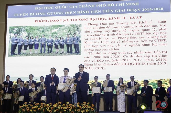 Trường Đại học Kinh tế - Luật có 01 tập thể (Phòng Đào tạo) và 03 cá nhân: GS.TS Nguyễn Thị Cành (Giảng viên cao cấp Khoa Tài chính - Ngân hàng), TS Nguyễn Thanh Trọng (Trưởng Phòng Đào tạo) và cựu sinh viên Huỳnh Mạnh Phương ( K16 Khoa Luật) là những gương tập thể, cá nhân điển hình tiên tiến giai đoạn 2015- 2020 vinh dự nhận Bằng khen của Giám đốc ĐHQG-HCM tại Đại hội.