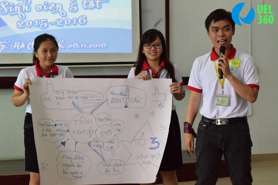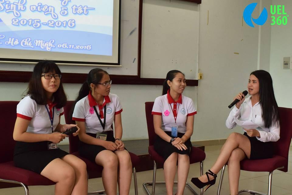 Bạn Nguyễn Hồng Hân, Khoa Luật Kinh tế; Bạn Trịnh Thị Lụa Khoa Tài Chính ngân hàng; Và bạn Huỳnh Thị Thu Trang Khoa Kinh tế đối ngoại đại diện cho SV5T trường ĐH Kinh tế - Luật năm học 2015 - 2016 chia sẻ về quá trình phấn đấu và những nguyện vọng của SV5T