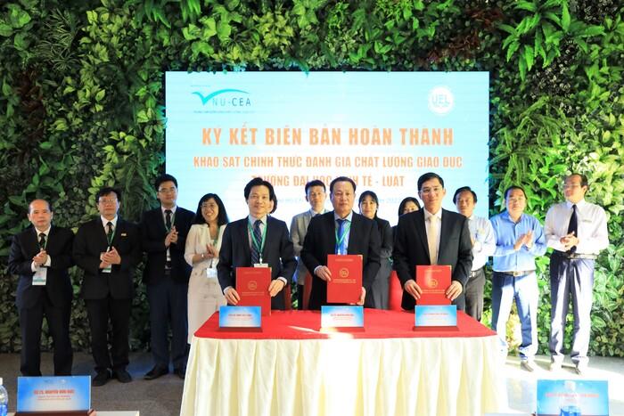 Kết thúc lễ bế mạc, đại diện Đoàn Chuyên gia ĐGN và lãnh đạo Trường Đại học Kinh tế - Luật đã ký biên bản hoàn thành khảo sát chính thức phục vụ ĐGN của Trường.