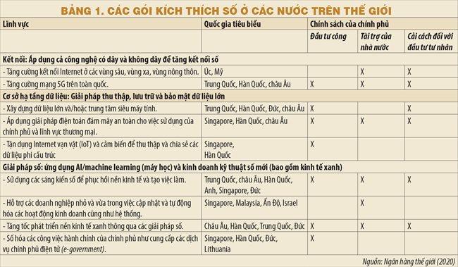 Tăng tốc số hóa nền kinh tế: Nhiều gói kích thích bao gồm hỗ trợ cho việc số hóa các doanh nghiệp nhỏ và vừa và các dịch vụ của chính phủ, việc làm xanh và/hoặc đầu tư vào đổi mới sáng tạo và R&D (nghiên cứu, phát triển) để xây dựng một hệ sinh thái định hướng số. Ví dụ, Đức đầu tư giải quyết vấn đề biến đổi khí hậu, đổi mới và công nghệ số, bao gồm đầu tư công và khu vực tư nhân tài trợ cho cơ sở hạ tầng sạc điện tử (e-charging), các dự án AI và các dịch vụ chính phủ điện tử.