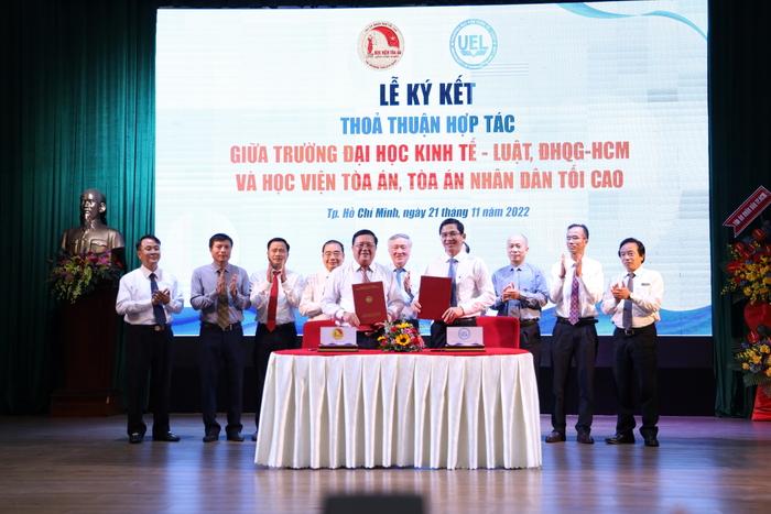 Trong khuôn khổ chương trình, Trường Đại học Kinh tế - Luật và Học viện Tòa án cũng đã thực hiện ký kết hợp tác với 04 nội dung bao gồm: