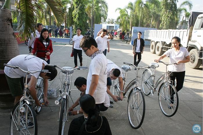Các thầy, cô Trường ĐH Kinh tế- Luật hoàn thiện khâu lắp ráp xe đạp
