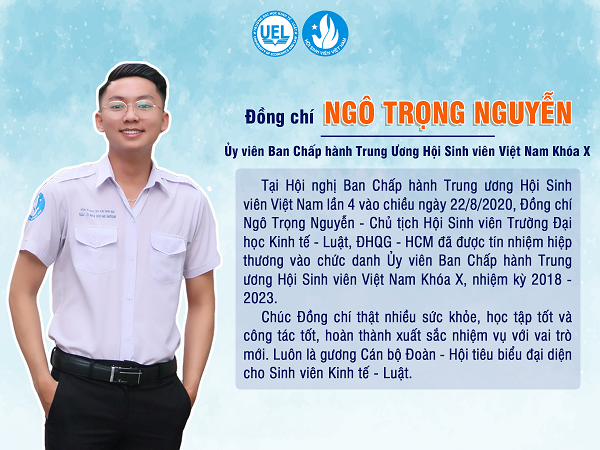 Vào chiều ngày 22/8/2020, tại Hội nghị Ban Chấp hành Trung ương Hội Sinh viên Việt Nam lần 4, Đồng chí Ngô Trọng Nguyễn - Chủ tịch Hội Sinh viên Trường Đại học Kinh tế - Luật, ĐHQG-HCM đã được tín nhiệm hiệp thương vào chức danh Uỷ viên Ban Chấp hành Trung ương Hội Sinh viên Việt Nam khóa X, nhiệm kỳ 2018 - 2023.