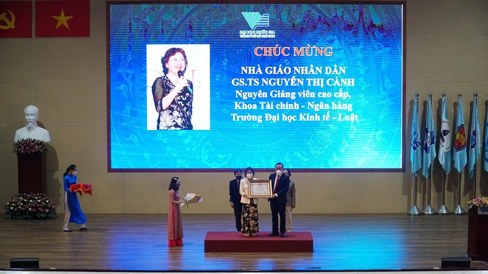 PGS.TS Vũ Hải Quân- Giám đốc ĐHQG TP.HCM trao danh hiệu Nhà giáo Nhân dân cho GS.TS Nguyễn Thị Cành