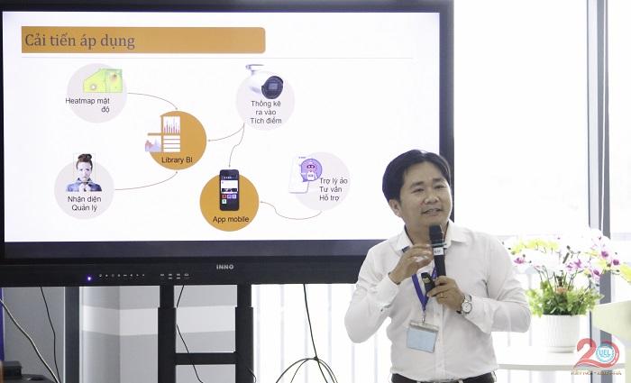trình bày phần tham luận "Giải pháp thư viện thông minh - IOT Smart Library"