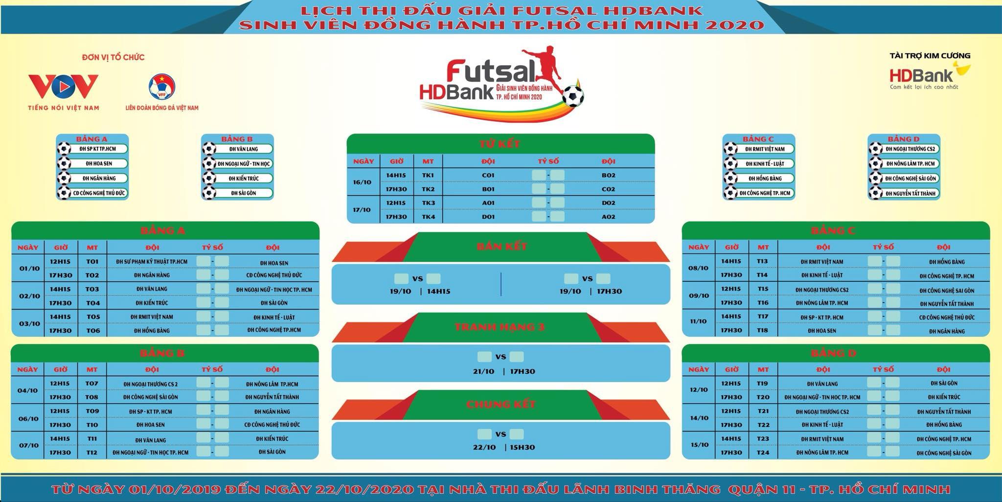Từ ngày 1/10 đến ngày 22/10/2020, giải FUTSAL HDBANK SINH VIÊN ĐỒNG HÀNH THÀNH PHỐ HỒ CHÍ MINH 2020 với sự tham gia của 16 đội tuyển của các trường đại học, cao đẳng trên toàn thành phố. Giải đấu được diễn ra tại Nhà thi đấu Lãnh Binh Thăng, Quận 11, TP. Hồ Chí Minh.