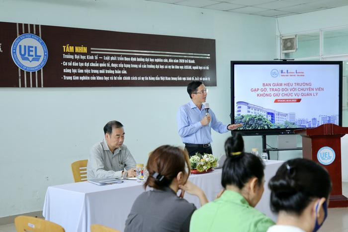Tại buổi đối thoại, các ý kiến, đóng góp tập trung vào việc cải tiến quy trình phối hợp làm việc giữa các đơn vị; chính sách về thu nhập, phúc lợi và cơ sở vật chất, trang thiết bị để phục vụ đội ngũ chuyên viên hiện tại cũng như thu hút nguồn lực chất lượng cao trong thời gian tới; việc phát triển văn hoá UEL; xây dựng hệ thống dữ liệu phục vụ công tác kiểm định và các công tác khác...