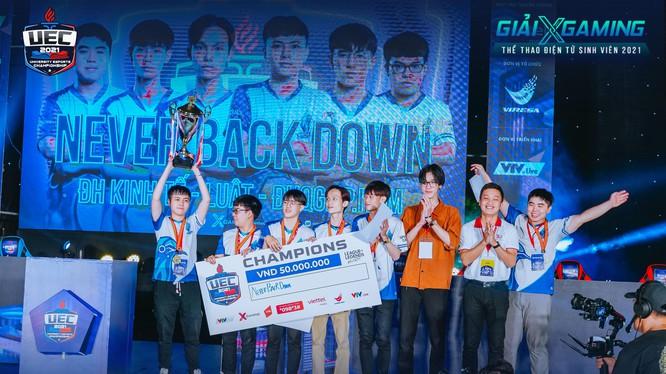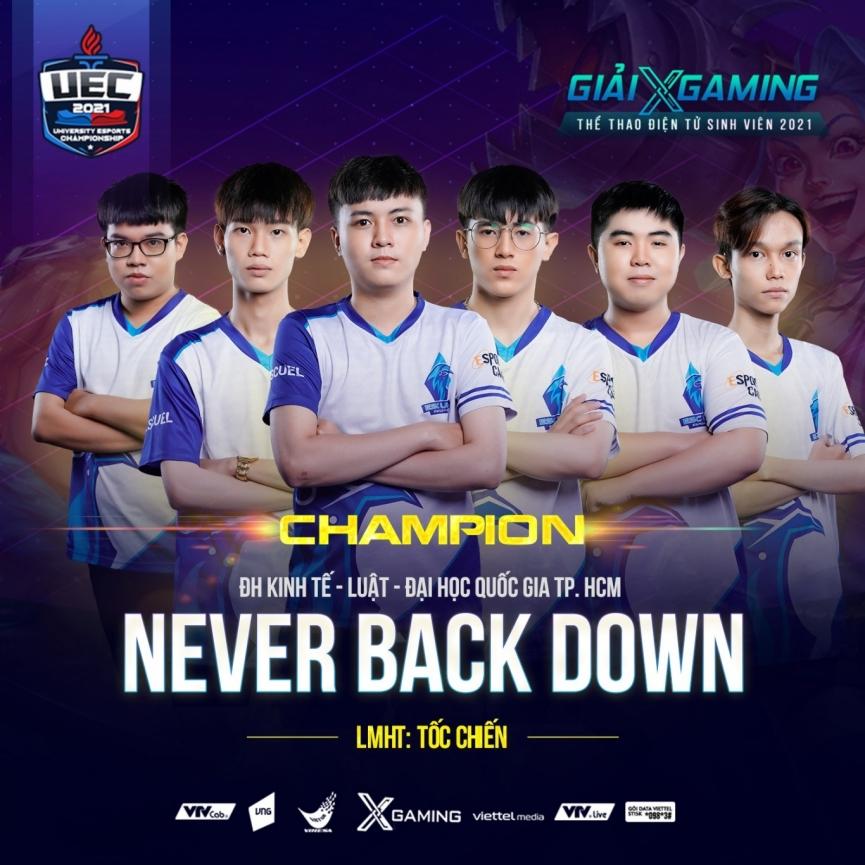 Thi đấu dưới cái tên "Never Back Down", các chàng trai đến từ Trường Đại học Kinh tế - Luật (ĐHQG-HCM) đã cho thấy họ không bao giờ lùi bước. Với sức bật mạnh mẽ, sự ăn ý và cũng như quyết tâm cao độ, đội tuyển Never Back Down đã mang vinh quang về cho Trường.