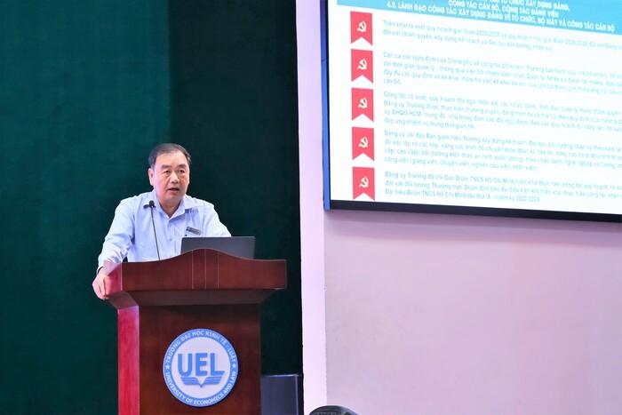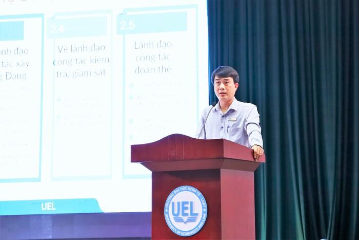 Tiếp theo chương trình, đồng chí Võ Văn Trọng - Ủy viên BTV Đảng bộ, Chủ nhiệm UBKT Đảng ủy Trường Đại học Kinh tế - Luật cũng đã báo cáo về kết quả sơ kết giữa nhiệm kỳ 2020-2025. Công tác tổ chức xây dựng Đảng của Trường được triển khai đầy đủ, toàn diện, xuyên suốt và đồng đều giữa các nhiệm vụ, giải pháp. Trường đã tận dụng được cơ chế tự chủ để tăng tính chủ động, linh hoạt trong điều hành. Bên cạnh đó, việc thay đổi cơ cấu tổ chức bước đầu đã phát huy tác dụng, các mảng công tác chuyên môn được phân công, phân nhiệm ngày càng hợp lý. Đảng ủy Trường có nhiều giải pháp hiệu quả trong công tác đẩy mạnh xây dựng tổ chức Đảng mạnh về tư tưởng, chính trị; bảo đảm tinh thần đoàn kết trong toàn đảng bộ, đảng viên, VC-NLĐ, người học của Trường. Các tổ chức Đoàn thể phát huy tốt thế mạnh; hoàn thành thắng lợi nhiệm vụ được Đảng ủy Trường giao phó.