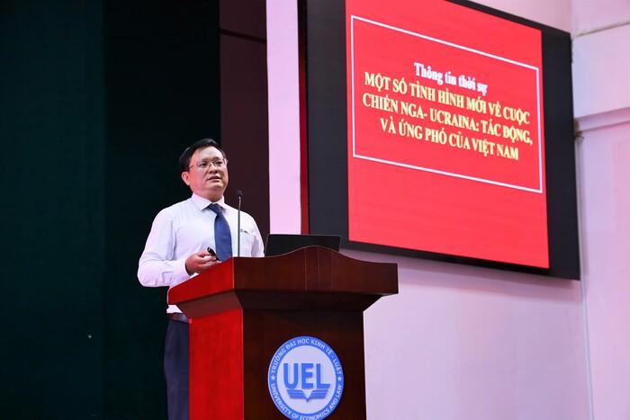 Đồng chí Lê Vũ Nam - Phó Bí thư Đảng ủy, Phó Hiệu trưởng trình bày báo cáo công tác Đảng năm 2022 và phương hướng năm 2023