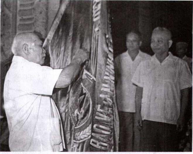 Chủ tịch nước Tôn Đức Thắng gắn Huân chương Hồ Chí Minh lên cờ truyền thống của lực lượng CAND, ngày 19-8-1975.