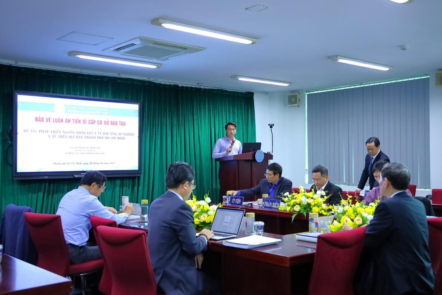 NCS Phạm Ngọc Nam đã hoàn thành đề tài luận án: "Phát triển nguồn nhân lực y tế đáp ứng sự nghiệp y tế trên địa bàn Thành phố Hồ Chí Minh" thuộc chuyên ngành Kinh tế chính trị với sự hướng dẫn khoa học của PGS.TS Nguyễn Tiến Dũng và TS Trần Phiên.