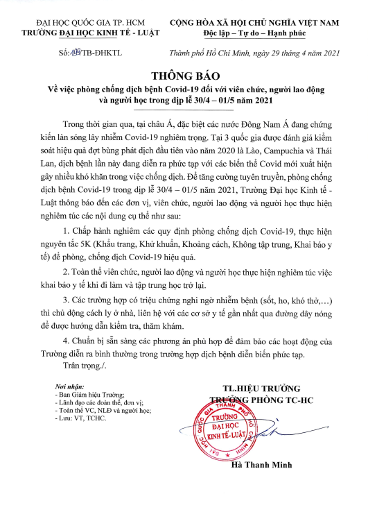 Phòng Tổ chức - Hành chính kính gửi Thông báo số 199/TB-ĐHKTL về việc phòng chống dịch bệnh Covid-19 đối với viên chức, người lao động và người học trong dịp lễ 30/4 - 01/5 năm 2021.