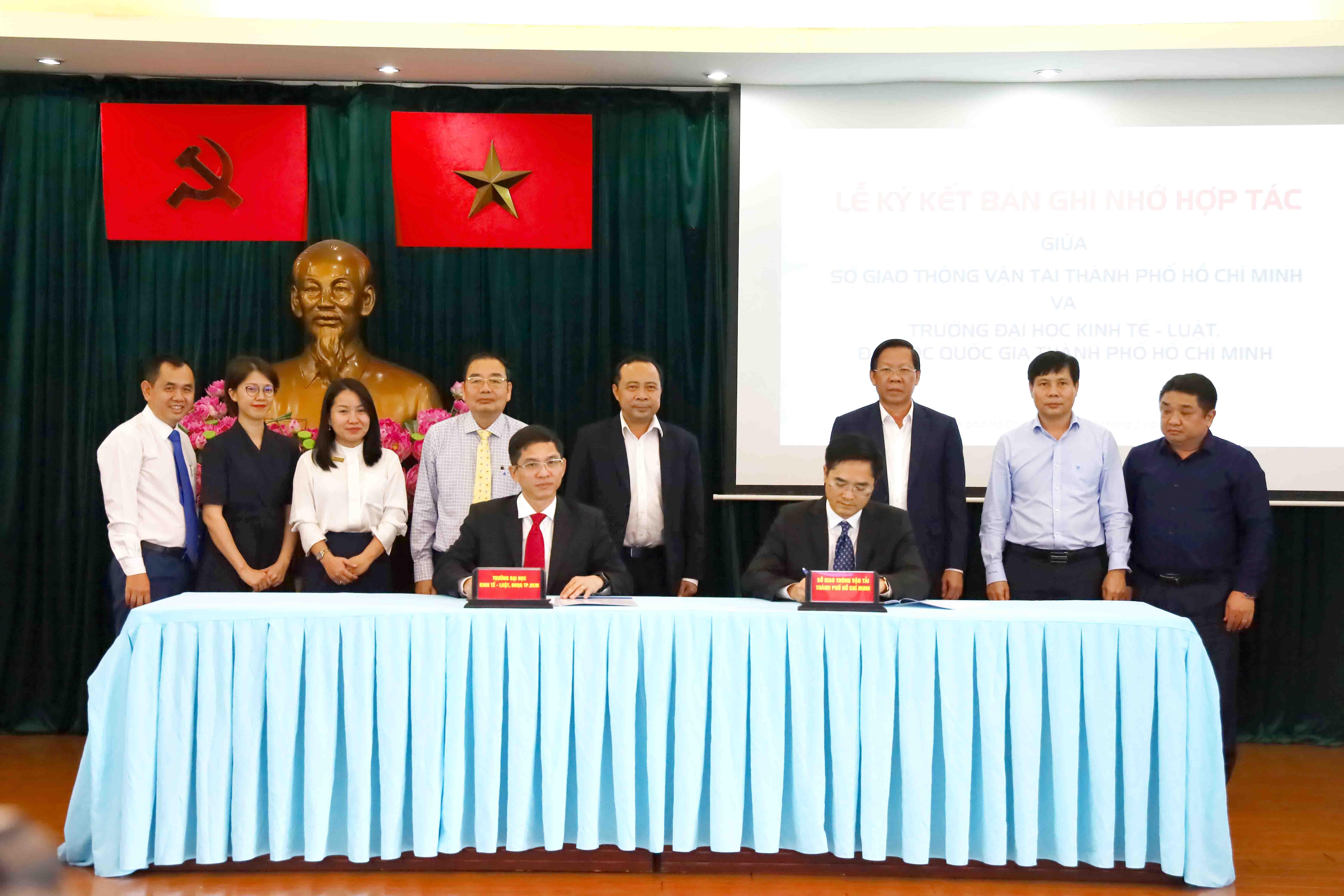 Ông Trần Quang Lâm - Giám đốc Sở Giao thông vận tải TP.HCM và PGS.TS Hoàng Công Gia Khánh - Hiệu trưởng Trường Đại học Kinh tế - Luật đã thực hiện nghi thức ký kết dưới sự chứng kiến của ông Phan Văn Mãi - Chủ tịch UBND TP.HCM, PGS.TS Vũ Hải Quân - Giám đốc Đại học Quốc gia TP.HCM, lãnh đạo các sở ngành TP.HCM cùng đại diện lãnh đạo hai đơn vị.