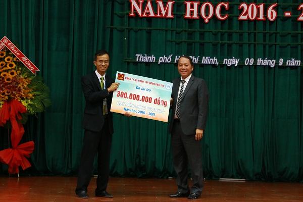 Đại diện doanh nghiệp đối tác trao học bổng và tài trợ các hoạt động năm học 2016 - 2017 cho Nhà trường.