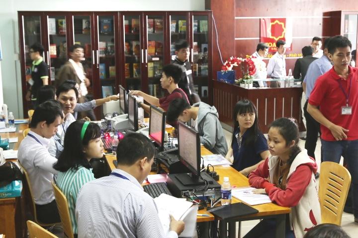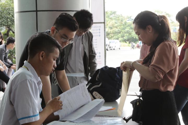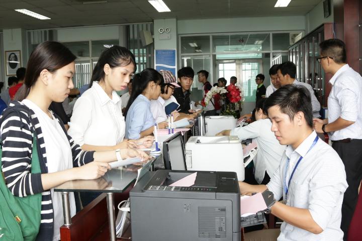 Từ 7 giờ sáng, lượng tân sinh viên và phụ huynh đã có mặt đông đúc ở Trường. Các em được hướng dẫn đến lần lượt từng khu vực để hoàn tất các bước trong quy trình hoàn tất thủ tục nhập học một cách khoa học.