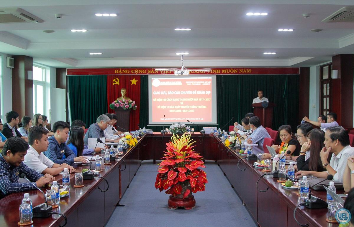 Ngày 06.11.2017, tại Trường Đại học Kinh tế - Luật đã diễn ra buổi giao lưu, báo cáo chuyên đề nhân dịp Kỷ niệm 100 năm Cách mạng Tháng Mười Nga (1917 - 2017) và Kỷ niệm 17 năm Ngày truyền thống Trường (06/11/2000 - 06/11/2017)
