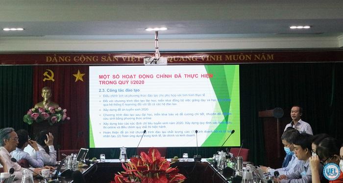Chương trình của Hội nghị gồm các nội dung: Báo cáo tình hình nhà trường từ 02/02/2020 đến nay; Công tác chuẩn bịhọc tập trung và Bộ Chỉ số rủi ro lây nhiễm Covid-19; Tiếp tục triển khai các hoạt động hướng tới UEL20; Báo cáo về tiến độ và kế hoạch KTL.B2; Công tác chuẩn bị Đại hội Đảng bộ Trường.