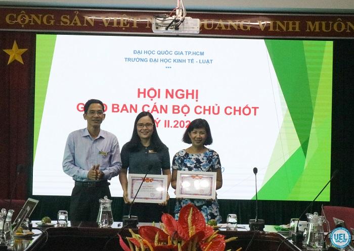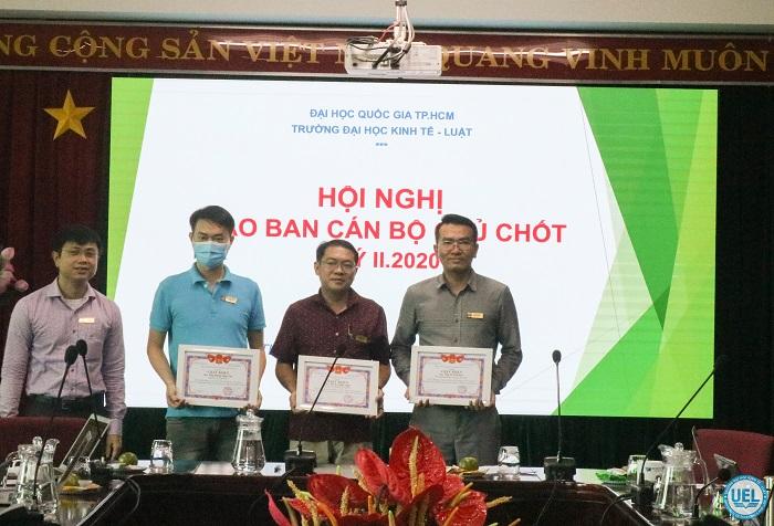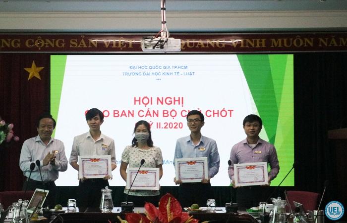 TS Phạm Quốc Thuần - Chủ tịch Công đoàn Trường trao khen thưởng cho các cá nhân đã có đóng góp tích cực hỗ trợ KTX ĐHQG-HCM chuẩn bị khu cách ly tập trung trong giai đoạn phòng, chống dịch bệnh Covid-19 PGS.TS Hoàng Công Gia Khánh - Phó Hiệu trưởng nhà trường trao khen thưởng tập thể tích cực tham gia giảng dạy trực tuyến đạt hiệu quả trong giai đoạn phòng, chống dịch Covid-19 cho Khoa Kinh tế đối ngoại và Toán Kinh tế.