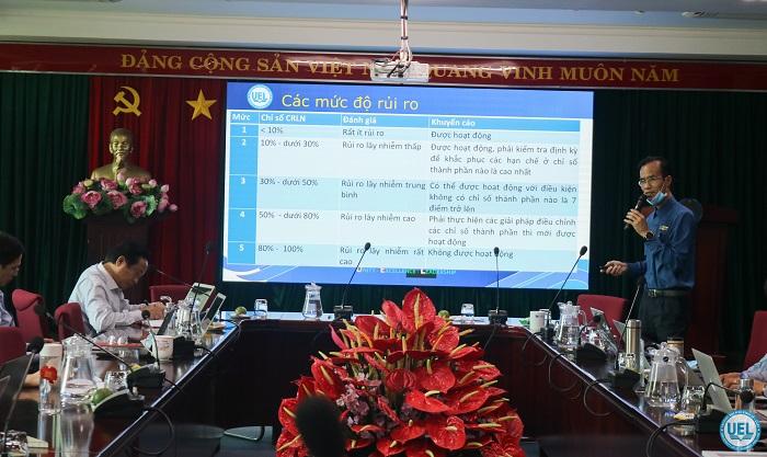 PGS.TS Lê Tuấn Lộc - Phó Bí thư Đảng ủy, Phó Hiệu trưởng Nhà trường trình bày Công tác chuẩn bị học tập trung và Bộ Chỉ số rủi ro lây nhiễm Covid-19