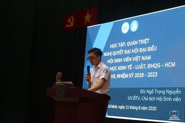 Ảnh: Đ/c Ngô Trọng Nguyễn - Chủ tịch Hội Sinh viên Trường báo cáo chuyên đề 3: Quán triệt nghị quyết Đại hội Đại biểu Hội Sinh viên