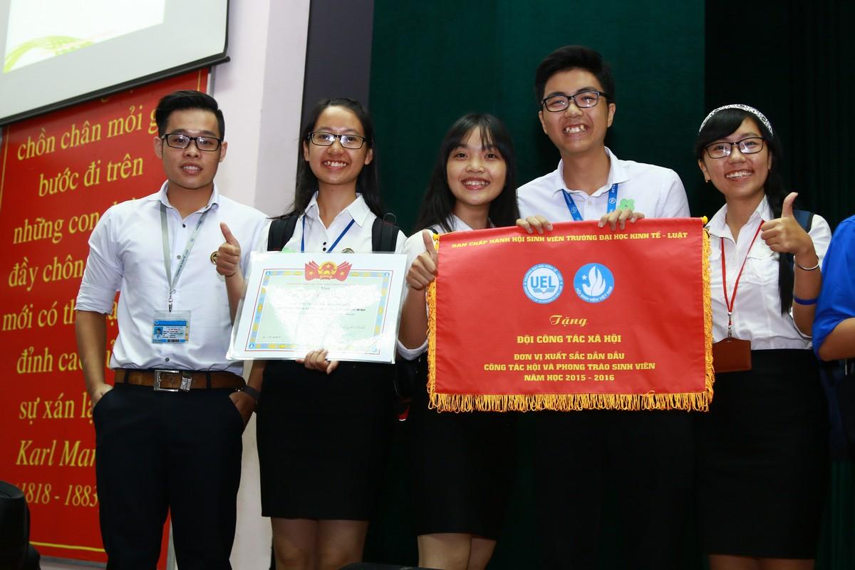 Đ/c Ông Thị Ngọc Linh - Bí thư Ban Cán sự Đoàn ĐHQG - HCM, TS. Lê Tuấn Lộc - Phó Bí thư Đảng ủy, Phó Hiệu trưởng, Th.S Hà Thanh Minh - UVBTV Đảng ủy, Trưởng Phòng Tổ chức - Hành chính, Đ/c Hoàng Ngọc Hiếu - Bí thư Đoàn trường trao danh hiệu Xuất sắc dẫn dần công tác Đoàn - Hội cho 4 tập thể: Đoàn Khoa Kinh tế, LCH Khoa Kinh tế đối ngoại, CLB Wapa (Đoàn Khoa Kế toán - Kiểm toán) và Đội Công tác xã hội.