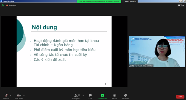 ThS Tô Thị Thanh Trúc - Phó Trưởng Khoa TCNH trình bày tham luận "Các hình thức đánh giá môn học tại Khoa Tài chính ngân hàng và một số ý kiến về công tác tổ chức thi trực tuyến"