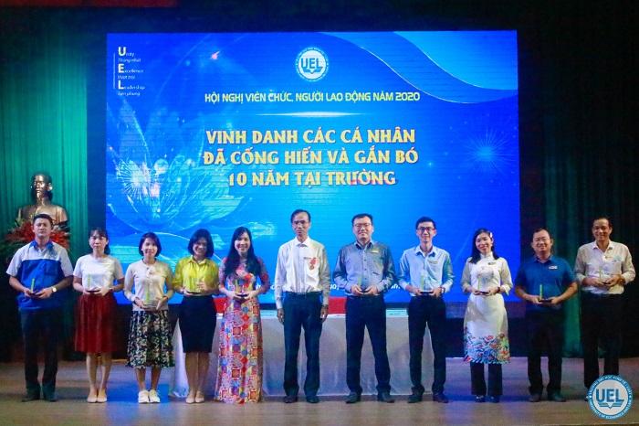Tại Hội nghị, nhà trường đã vinh danh các tập thể và cá nhân xuất sắc nhận Huân Chương lao động hạng 3, cờ thi đua, danh hiệu, bằng khen của Bộ Giáo dục & Đào tạo, ĐHQG-HCM,cùng các cá nhân đã có quá trình công tác, cống hiến lâu dài cho Trường.