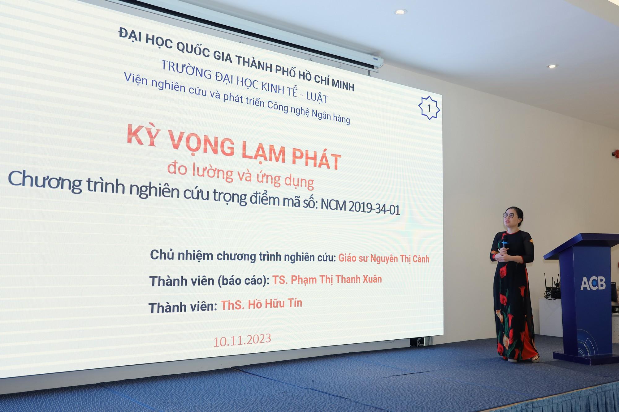 Đại diện nhóm nghiên cứu của Viện Nghiên cứu phát triển Công nghệ Ngân hàng (IBT), Trường Đại học Kinh tế - Luật, TS Phạm Thị Thanh Xuân trình bày kết quả nghiên cứu về kỳ vọng lạm phát, gồm cách đo lạm phát nhận thức, lạm phát kỳ vọng, hiệu ứng loss aversion trong nền kinh tế Việt Nam, đồng thời công bố website https://lamphatkyvong.uel.edu.vn/, một sản phẩm ứng dụng thuộc khuôn khổ chương trình nghiên cứu trọng điểm của Viện IBT - UEL. Website có giá trị ứng dụng thiết thực và hiện đã được chuyển giao cho Ban Kinh tế Trung ương sử dụng như một kênh tham khảo phục vụ công tác điều hành vĩ mô.