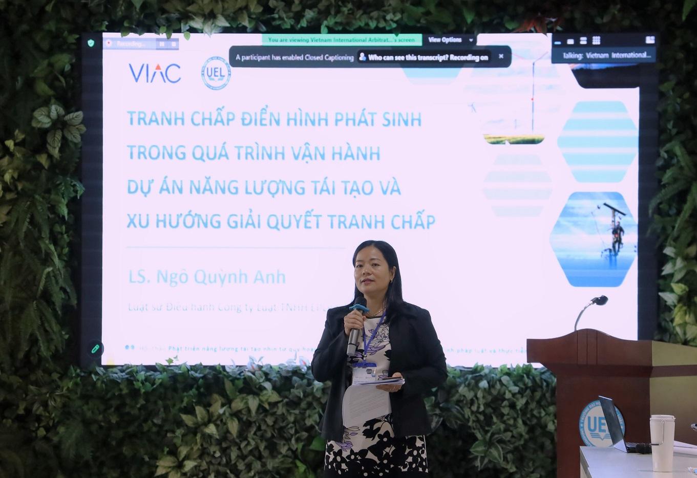 LS Ngô Quỳnh Anh - Luật sư điều hành Công ty Luật TNHH EPLegal trình bày tham luận "Tranh chấp điển hình phát sinh trong quá trình vận hành dự án năng lượng tái tạo và xu hướng giải quyết tranh chấp"