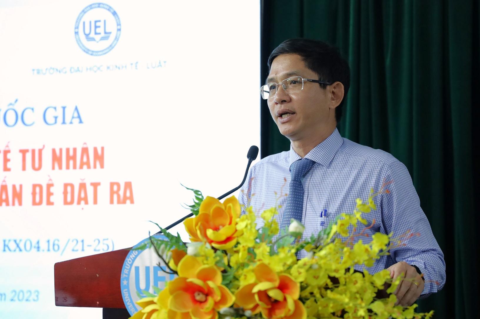 Phát biểu khai mạc Hội thảo, PGS.TS Hoàng Công Gia Khánh - Hiệu trưởng UEL đã nhấn mạnh vai trò của kinh tế tư nhân đối với nền kinh tế nước ta hiện nay cũng như đề cập đến một số tồn tại như: năng suất và tốc độ tăng năng suất của khu vực kinh tế tư nhân còn thấp, năng lực khoa học công nghệ của kinh tế tư nhân còn hạn chế,... Chính vì vậy, Hội thảo thuộc khuôn khổ đề tài khoa học cấp quốc gia được tổ chức để các nhà khoa học, nhà nghiên cứu cùng thảo luận để tìm ra giải pháp tháo gỡ khó khăn và góp phần phát triển kinh tế tư nhân của người Việt Nam.