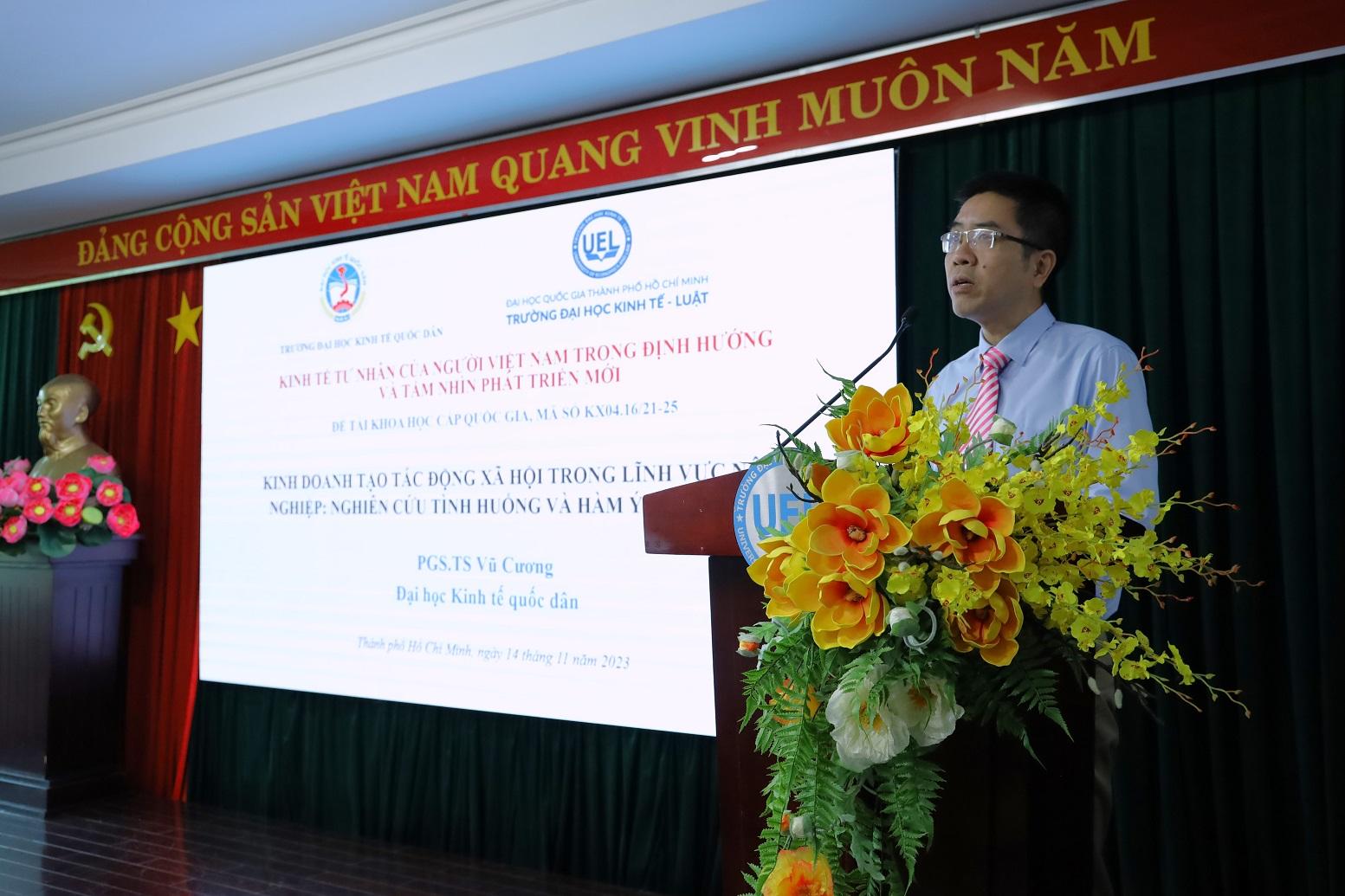 Tại Hội thảo, GS.TS Ngô Thắng Lợi - Chủ nhiệm đề tài cho biết "Thực trạng phát triển kinh tế tư nhân của người Việt Nam và những vấn đề đặt ra" là đề tài thứ ba mà giáo sư và nhóm nghiên cứu phối hợp cùng Trường Đại học Kinh tế - Luật thực hiện. GS.TS Ngô Thắng Lợi chỉ rõ kinh tế tư nhân là một trong hai động lực lớn để phát triển kinh tế Việt Nam, vì vậy, giáo sư mong muốn thông qua Hội thảo, các đại biểu tham dự sẽ đưa ra được bức tranh toàn diện về thực trạng phát triển kinh tế tư nhân của Việt Nam trong thời gian qua, đồng thời, giải quyết được những vấn đề đặt ra để góp phần nâng tầm kinh tế tư nhân ở nước ta.