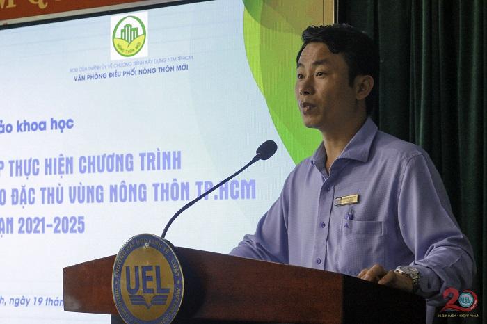 Tham luận 1: "Quan điểm và mục tiêu "Chương trình Mục tiêu quốc gia xây dựng nông thôn mới gắn với đô thị hóa, trên địa bàn vùng nông thôn TP.HCM, giai đoạn 2021 - 2025" và Bộ tiêu chí nông thôn mới theo đặc thù vùng nông thôn TP.HCM giai đoạn 2020-2025" - Ông Thái Quốc Dân - Phó Chánh VPĐD NTM TP.HCM trình bày;