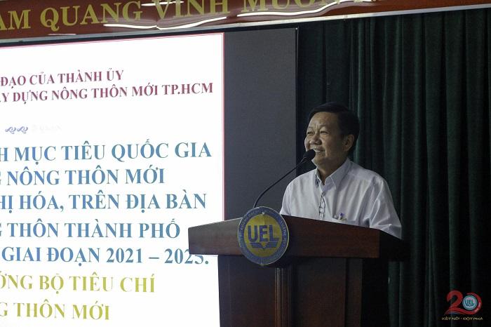 Phát biểu khai mạc Hội thảo, PGS.TS Nguyễn Tiến Dũng - Hiệu trưởng nhà trường cho biết Trường Đại học Kinh tế - Luật đã kết hợp với Chi cục NN VÀ PTNT TP.HCM thực hiện một số nội dung nghiên cứu khảo sát, đề xuất về các tiêu chí và những giải pháp trong chương trình xây dựng nông thôn mới với các đặc điểm cụ thể. Trong thời gian sắp tới UEL mong muốn sẽ tiếp tục nhận được sự quan tâm, phối hợp hỗ trợ của Văn phòng điều phối NTM cũng như các đơn vị trên địa bàn thành phố để nhà trường có những cơ hội đóng góp nhiều hơn trong việc nghiên cứu, tư vấn, tham mưu.
