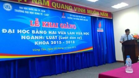 TS Lê Tuấn Lộc phát biểu tại lễ khai giảng ngày 5/12 ở Vũng tàu. Trước đó, ngày 5/12/2015, tai Vũng Tàu, Nhà trường cũng đã tổ chức lễ khai giảng Bằng hai ngành Luật dân sự theo chương trình liên kết đào tạo với Trường Cao đẳng nghề Dầu khí Vũng tàu với 81 thí sinh trúng tuyển.