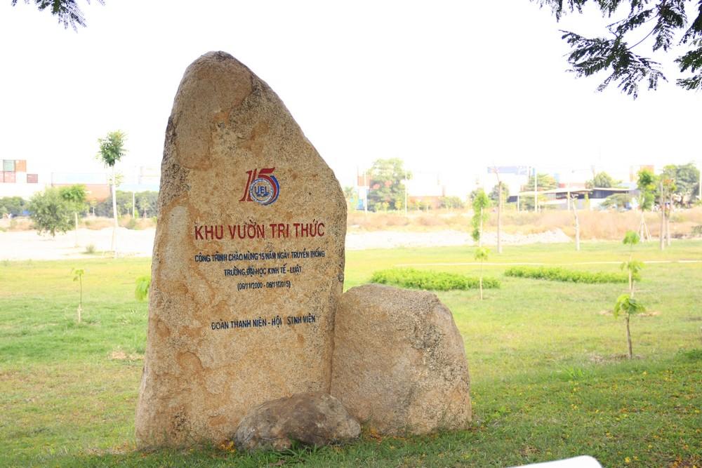 Khu vườn tri thức được hình thành ý tưởng của Đoàn Thanh niên - Hội Sinh viên Trường Đại học Kinh tế - Luật nhằm tạo thêm không gian học tập và sinh hoạt cho đoàn viên, sinh viên. Công trình được khởi công và khánh thành giai đoạn 1 nhân dịp đợt hoạt động chào mừng 15 năm Ngày truyền thống Trường Đại học Kinh tế - Luật (06/11/2000 - 06/11/2015) với việc trồng cây xanh, tạo cảnh quan và đặt tảng đá tên công trình.