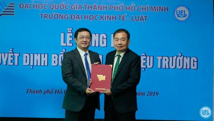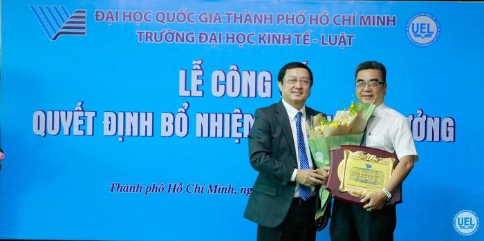 PGS.TS Huỳnh Thành Đạt trao quyết định bổ nhiệm đã trao quyết định bổ nhiệm chức vụ Phó Hiệu trưởng Trường Đại học Kinh tế - Luật cho PGS.TS Lê Vũ Nam.