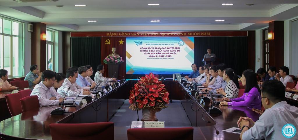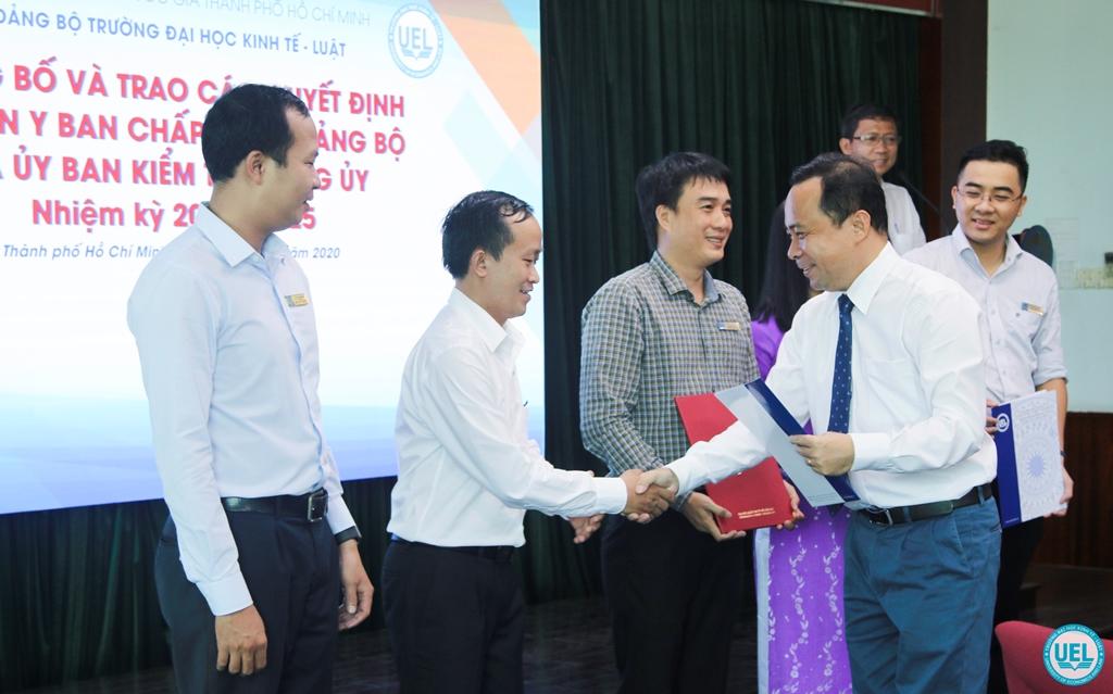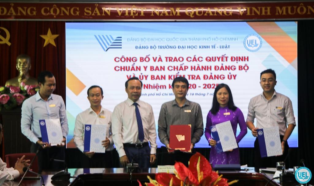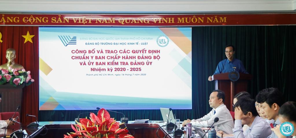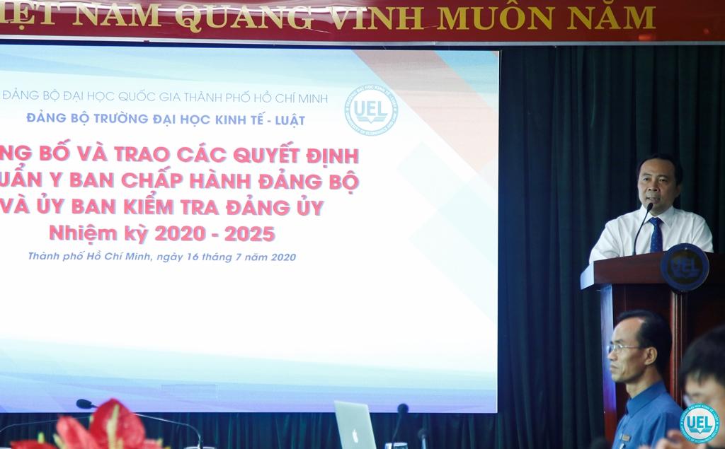 PGS.TS Nguyễn Văn Hiếu - UV,BTV, Trưởng Ban Tổ chức Đảng ủy ĐHQG-HCM điều hành phần công bố quyết định chuẩn y 15 đồng chí Ban Chấp hành Đảng bộ, 05 đồng chí tham gia Ủy ban Kiểm tra Đảng ủy Trường ĐH Kinh tế - Luật, nhiệm kỳ IV (2020-2025) và các chức danh chủ chốt; theo đó, chuẩn y Đ/c Lê Tuấn Lộc - giữ chức vụ Bí thư Đảng ủy; Đ/c Hoàng Công Gia Khánh, Đ/c Lê Vũ Nam giữ chức vụ Phó bí thư Đảng ủy; Đ/c Võ Văn Trọng giữ chức vụ Chủ nhiệm Ủy ban Kiểm tra Đảng ủy Trường.