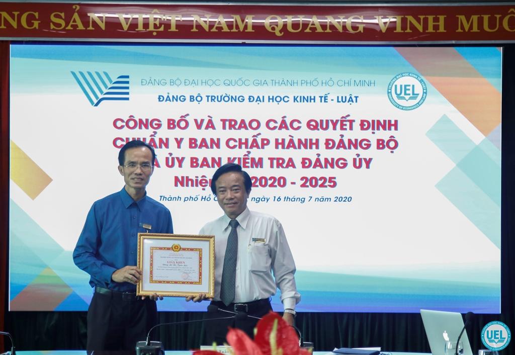 Tại buổi lễ, PGS.TS Nguyễn Tiến Dũng, UV.BTV Đảng ủy, Hiệu Trưởng Trường ĐH Kinh tế - Luật đã trao giấy khen của Đảng ủy ĐHQG-HCM cho PGS.TS Lê Tuấn Lộc - Bí thư Đảng ủy Trường đã hoàn thành xuất sắc nhiệm vụ 5 năm liên tục.