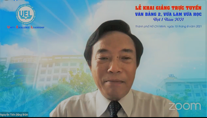 Phát biểu chào mừng tại Lễ khai giảng, PGS.TS Nguyễn Tiến Dũng - Hiệu trưởng Trường Đại học Kinh tế - Luật cho biết trong lần đầu tiên tổ chức lễ khai giảng đặc biệt trong điều kiện dịch bệnh Covid-19 diễn biến phức tạp, thầy gửi lời chúc mừng tân sinh viên đã trúng tuyển lớp Văn bằng 2 chính quy, Vừa làm vừa học đợt 1 để bắt đầu một hành trình mới theo đuổi việc học tập, tiếp tục trang bị và nâng cao kiến thức mới để đáp ứng nhu cầu công việc, cuộc sống.