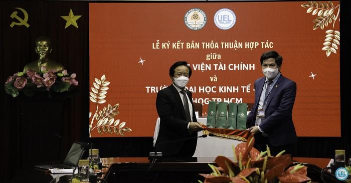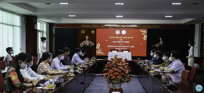 Vào chiều ngày 22/02/2022, Trường Đại học Kinh tế - Luật (UEL) đã tổ chức Lễ ký kết Biên bản thỏa thuận hợp tác giữa Học viện Tài chính và UEL. Lễ ký kết đánh dấu cột mốc quan trọng trong quá trình hợp tác tốt đẹp giữa hai trường trong các lĩnh vực nghiên cứu khoa học, đặc biệt là các vấn đề về chính sách và kinh tế vĩ mô.