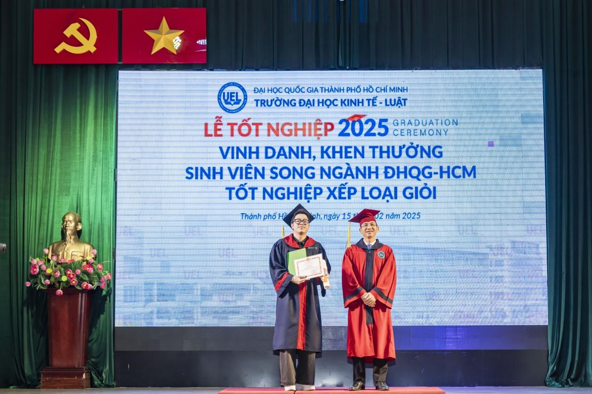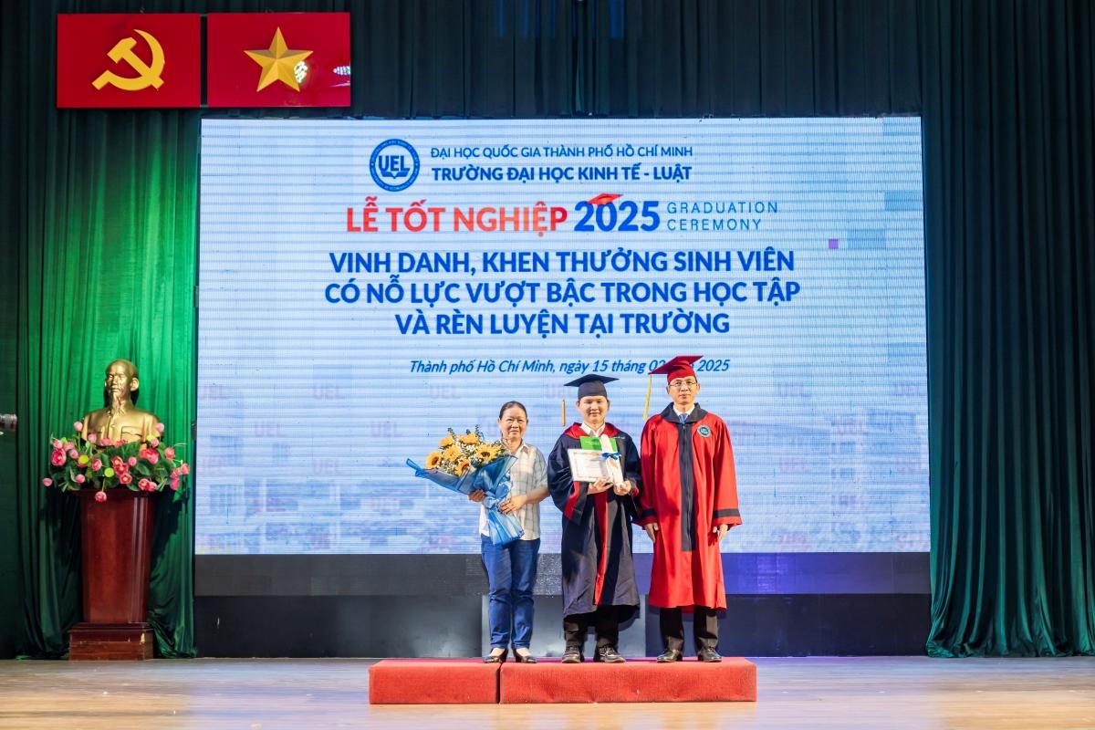 Đặc biệt, Trường dành lời chúc mừng đặc biệt và tuyên dương những nỗ lực vượt bậc của sinh viên Hoàng Chi Mạnh. Dù bị khuyết tật mắt bẩm sinh, chỉ có thể nhận biết được đốm sáng và đốm tối, không nhìn được hình thù vật thể nhưng Mạnh đã học tập và phát triển như những bạn bè cùng trang lứa. 4 năm tại UEL, Mạnh không ngừng nỗ lực, vượt qua những khiếm khuyết của bản thân để hoàn thành tốt nhất chương trình học.