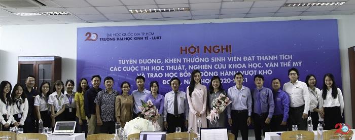 Trong thời gian vừa qua, đại dịch Covid-19 ở nước ta đã cơ bản đã được kiểm soát nhưng vẫn gây ảnh hưởng không nhỏ đến tình hình kinh tế và đời sống xã hội. Trong bối cảnh khó khăn và nhiều thử thách như vậy nhưng giảng viên, viên chức và sinh viên Trường Đại học Kinh tế - Luật vẫn không ngừng nỗ lực phấn đấu, kết quả đã đạt được rất nhiều thành tích xuất sắc trong nhiều nhiều lĩnh vực như: