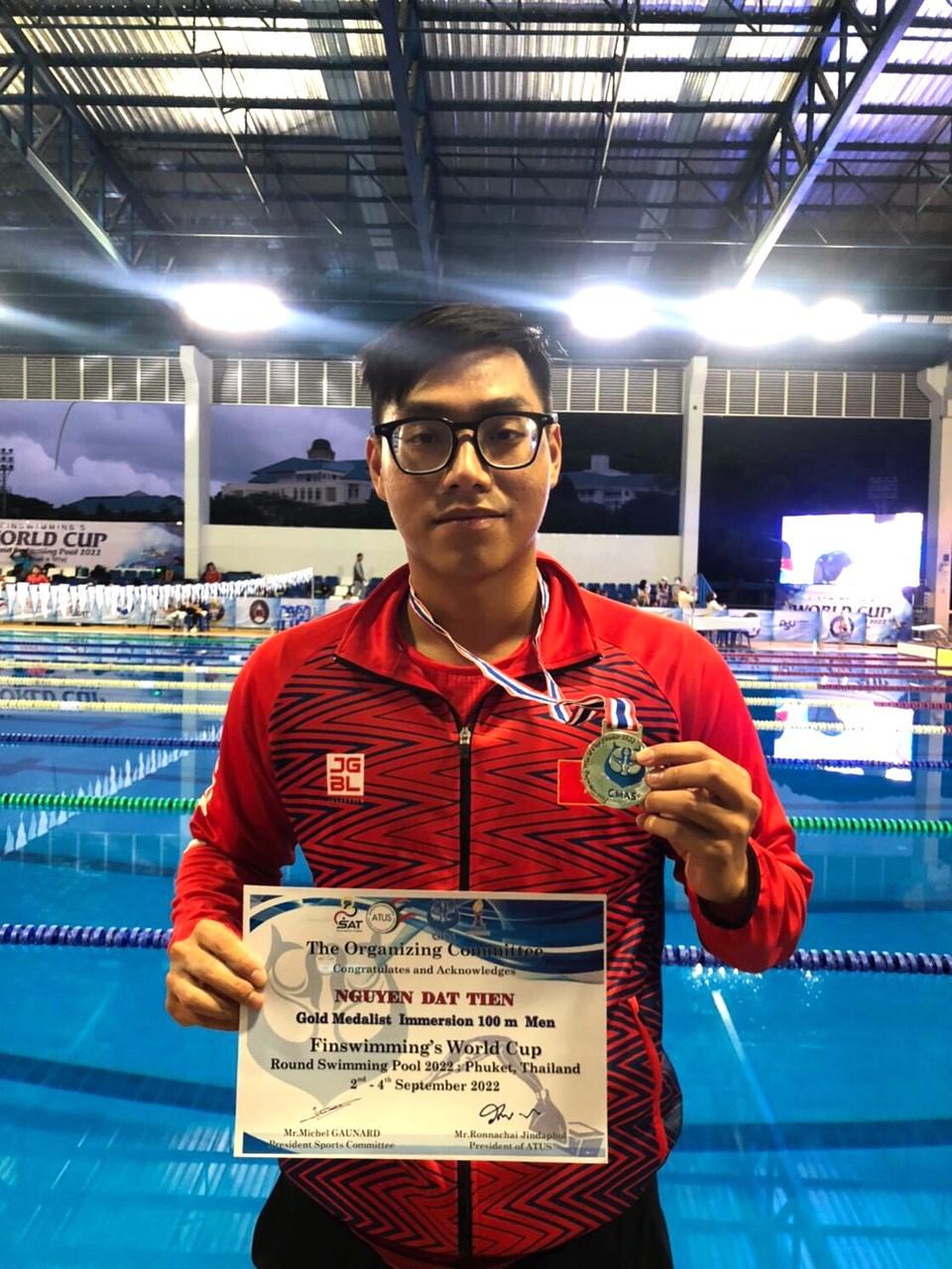Sinh viên Nguyễn Tiến Đạt - Khoa Toán kinh tế cùng đội tuyển lặn Việt Nam thi đấu tại Finswimming 's World Cup - Round Swimming Pool 2022: Phuket, Thailand