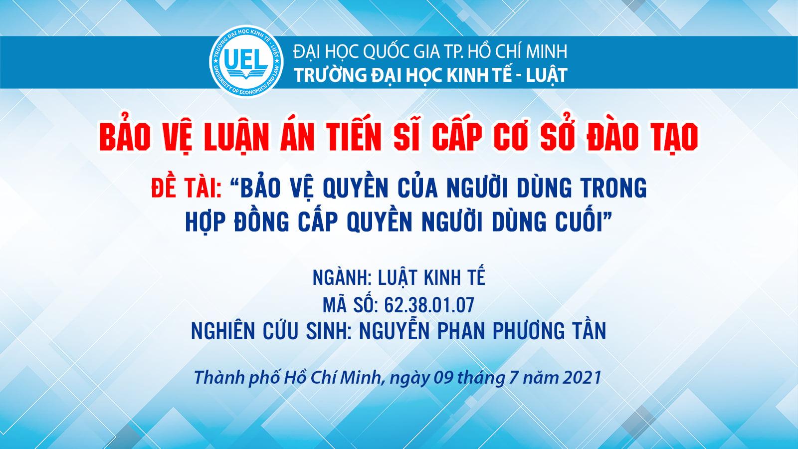 Ngày 09/7/2021, NCS Nguyễn Phan Phương Tần đã bảo vệ thành công luận án tiến sĩ cấp cơ sở đào tạo ngành Luật Kinh tế, mã số chuyên ngành: 62.38.01.07 với tên đề tài: "Bảo vệ quyền của người dùng cuối trong hợp đồng cấp quyền người dùng cuối".