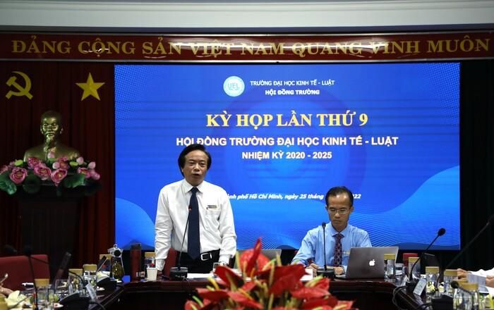 Thay mặt Ban giám hiệu, PGS.TS Lê Vũ Nam - Phó Hiệu trưởng đã thông qua báo cáo hoạt động Trường giữa hai kỳ họp. Trong nội dung của báo cáo đã thể hiện được kết quả thực hiện nhiệm vụ thường xuyên, công tác tuyển sinh và hoạt động đào tạo, công tác khảo thí và đảm bảo chất lượng, hoạt động khoa học công nghệ và hợp tác phát triển, phục vụ cộng đồng, công tác tài chính, cơ sở vật chất cũng các hoạt động đoàn thể khác. Tiếp nối chương trình, hội đồng trường cũng đề ra 8 nhiệm vụ trọng tâm sẽ thực hiện ngay trong tháng 12 năm 2022 và quý I năm 2023.