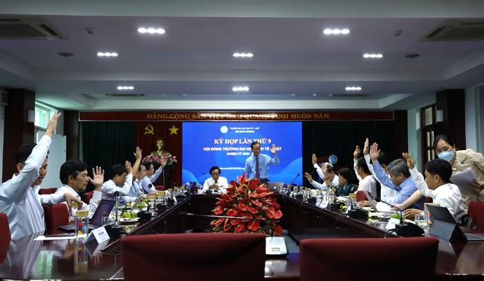 Hội đồng trường thảo luận và biểu quyết thông qua các nội dung quan trọng gồm: 1. Báo cáo giám sát; 2. Báo cáo tình hình hoạt động của Trường giữa hai kỳ họp; 3. Dự thảo quy chế tổ chức hoạt động của Hội đồng Trường, Trường Đại học Kinh tế - Luật; 4. Dự thảo quy chế hoạt động của Ban Giám sát Hội đồng Trường; 5. Dự thảo đề án sử dụng tài sản công tại Trường Đại học Kinh tế - Luật vào mục đích cho thuê; 6. Tóm tắt các nội dung dự kiến điều chỉnh Quy chế chi tiêu nội bộ và chính sách thu nhập, phụ cấp của chức danh lãnh đạo, quản lý năm 2023.