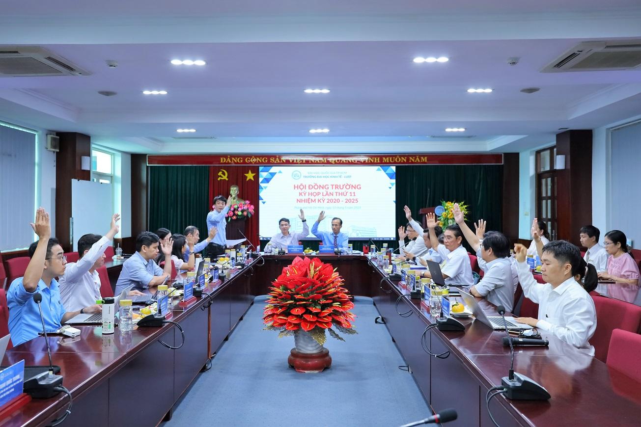 Các thành viên Hội đồng Trường biểu quyết thông qua nội dung tại kỳ họp lần thứ 11