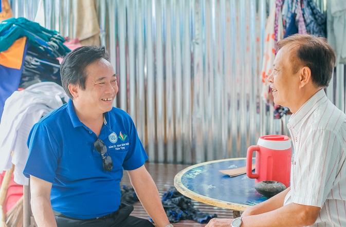 PGS.TS Nguyễn Tiến Dũng trò chuyện cùng Bác ba - Gia đình nuôi quân xã Hưng Nhượng - huyện Giồng Trôm