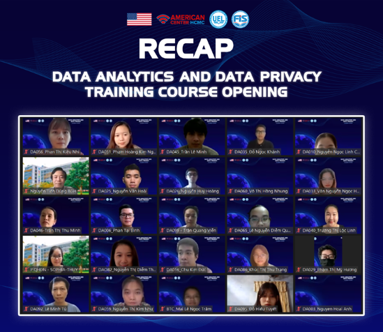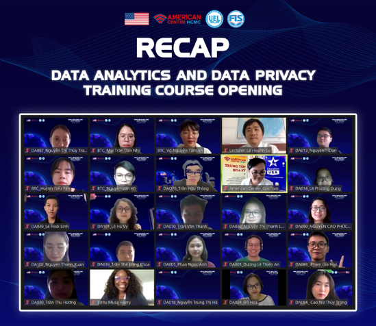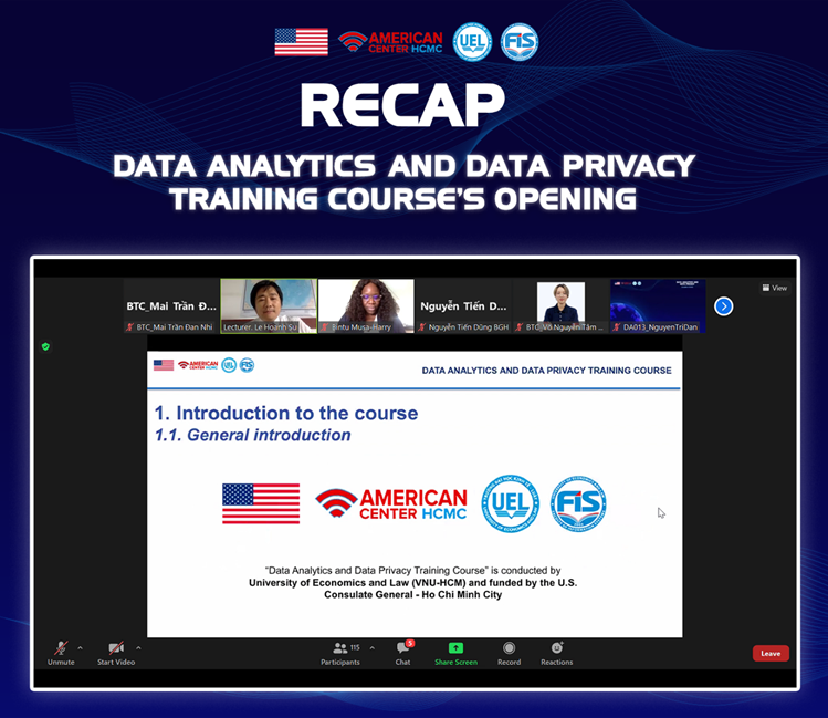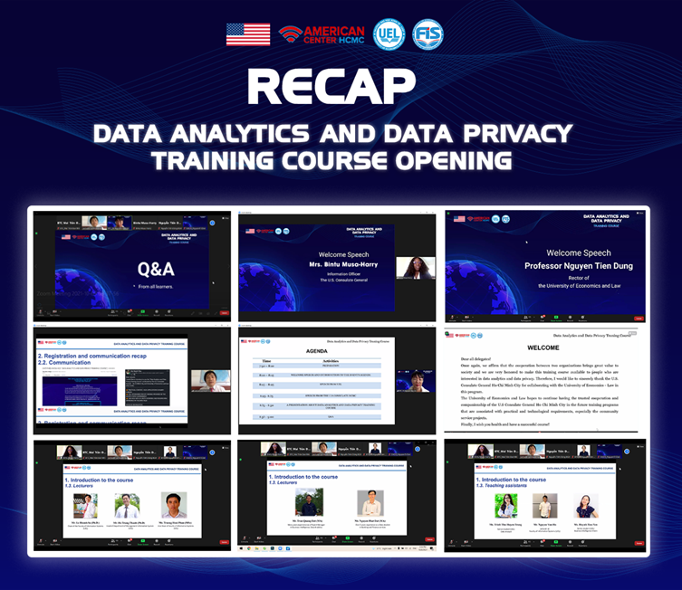 Sáng ngày 09/10/2021, Lễ Khai giảng khóa học "Data Analytics and Data Privacy" do Tổng Lãnh sự quán Hoa Kỳ tại Thành phố Hồ Chí Minh và Trường Đại học Kinh tế - Luật (ĐHQG TP.HCM) phối hợp tổ chức đã được được diễn ra theo hình thức trực tuyến.